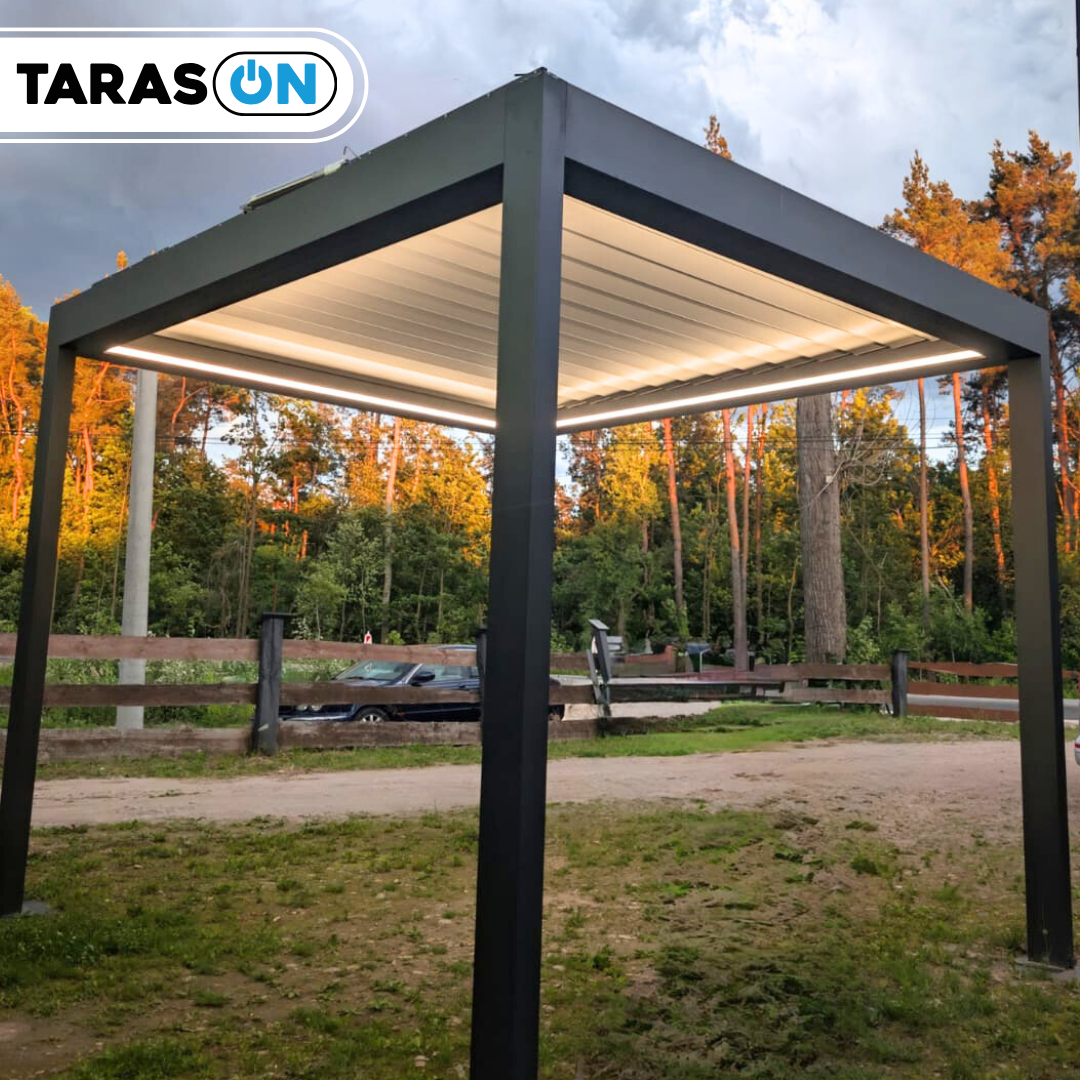 Dach z aluminiowych lameli umożliwia regulację kąta nachylenia, zapewniając ochronę przed słońcem i deszczem oraz komfortową wentylację pod zadaszeniem.
