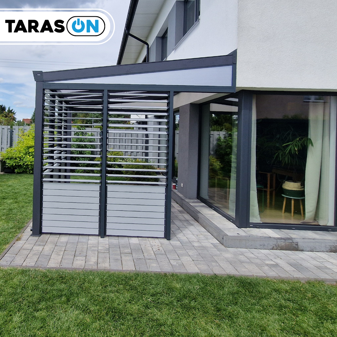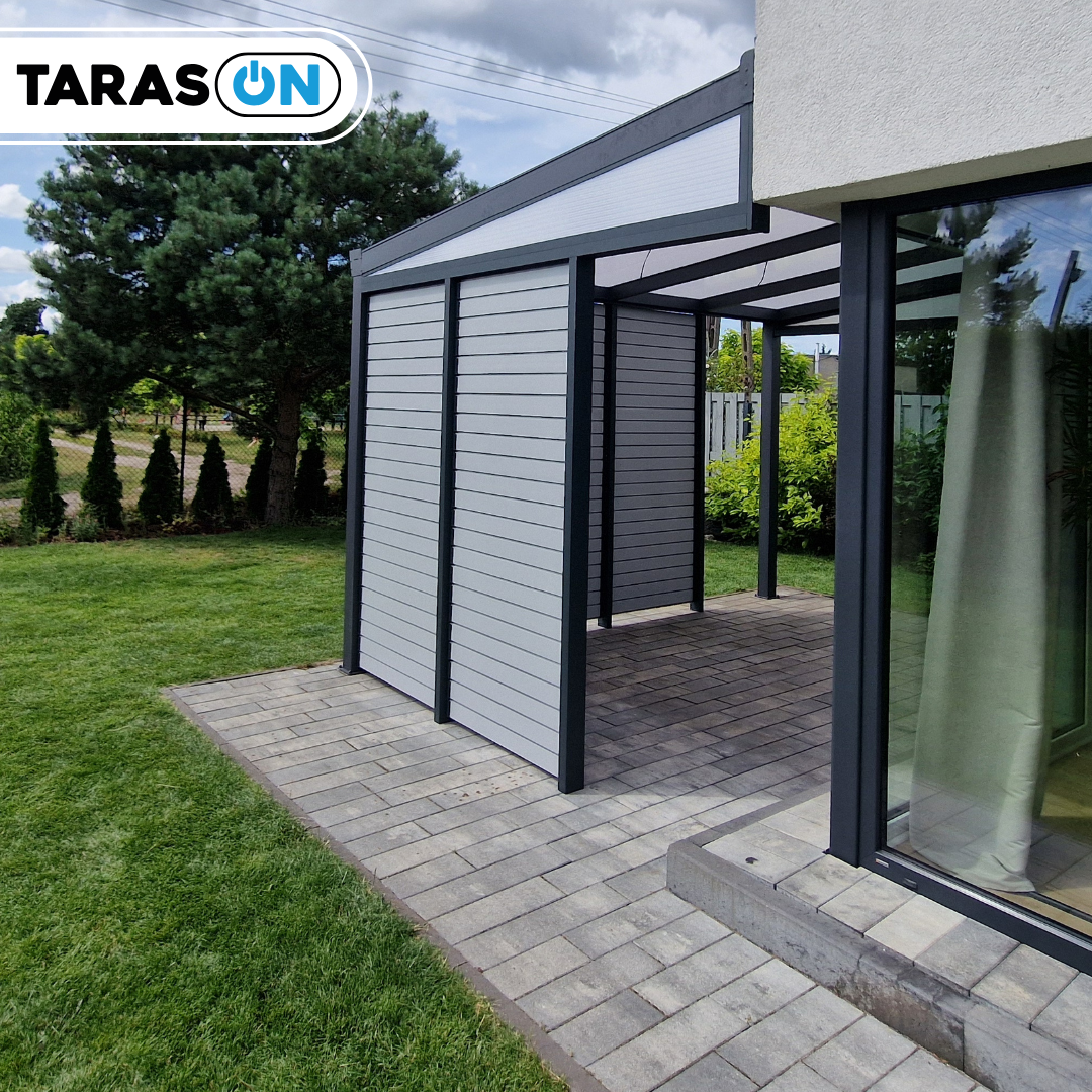 Zabudowę boczną tworzą aluminiowe ścianki – jedna podzielona na 3 sekcje, druga na 2, uzupełnione o trójkątne doświetlenia boczne. Całość tworzy lekką i nowoczesną formę, dobrze komponującą się z architekturą ogrodu lub elewacją domu.