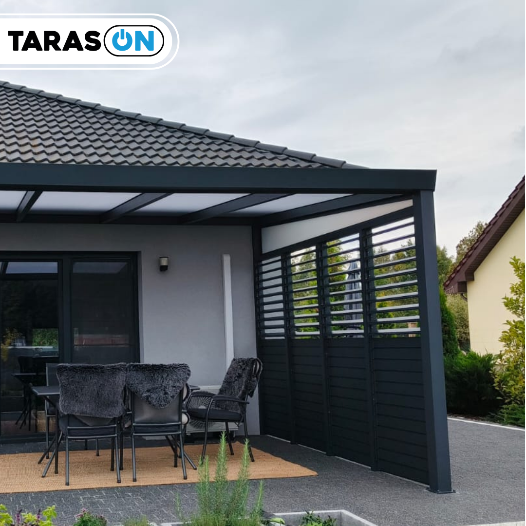 Taras osłonięto również poziomą zabudową boczną o szerokości 350 cm i wysokości 240 cm, podzieloną na cztery równe segmenty. Całość została utrzymana w jednolitej kolorystyce (RAL 7016): ramy, uchwyty i lamele tworzą spójne i eleganckie wykończenie przestrzeni.